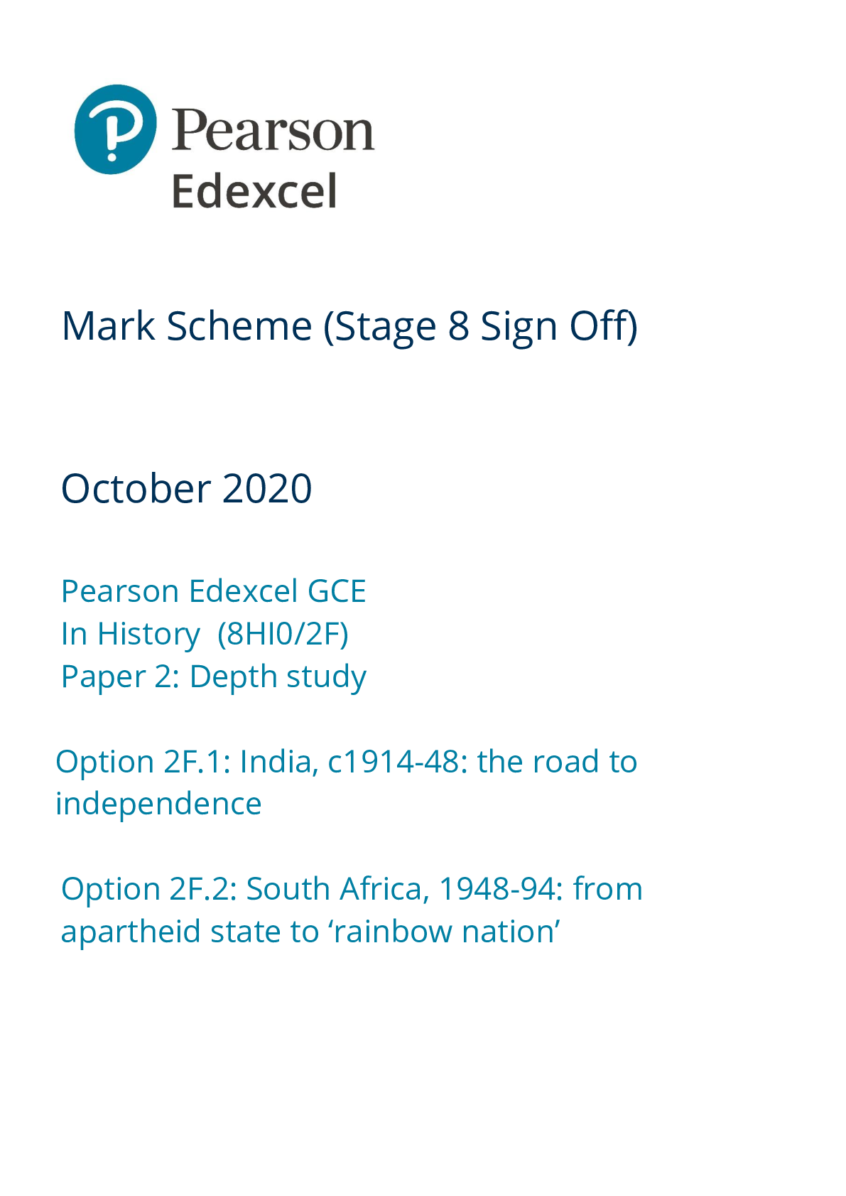 History > Edexcel Question Paper > Pearson Edexcel GCE_History_8HI0/2F Mark Scheme_2020 | Paper 2: Depth study