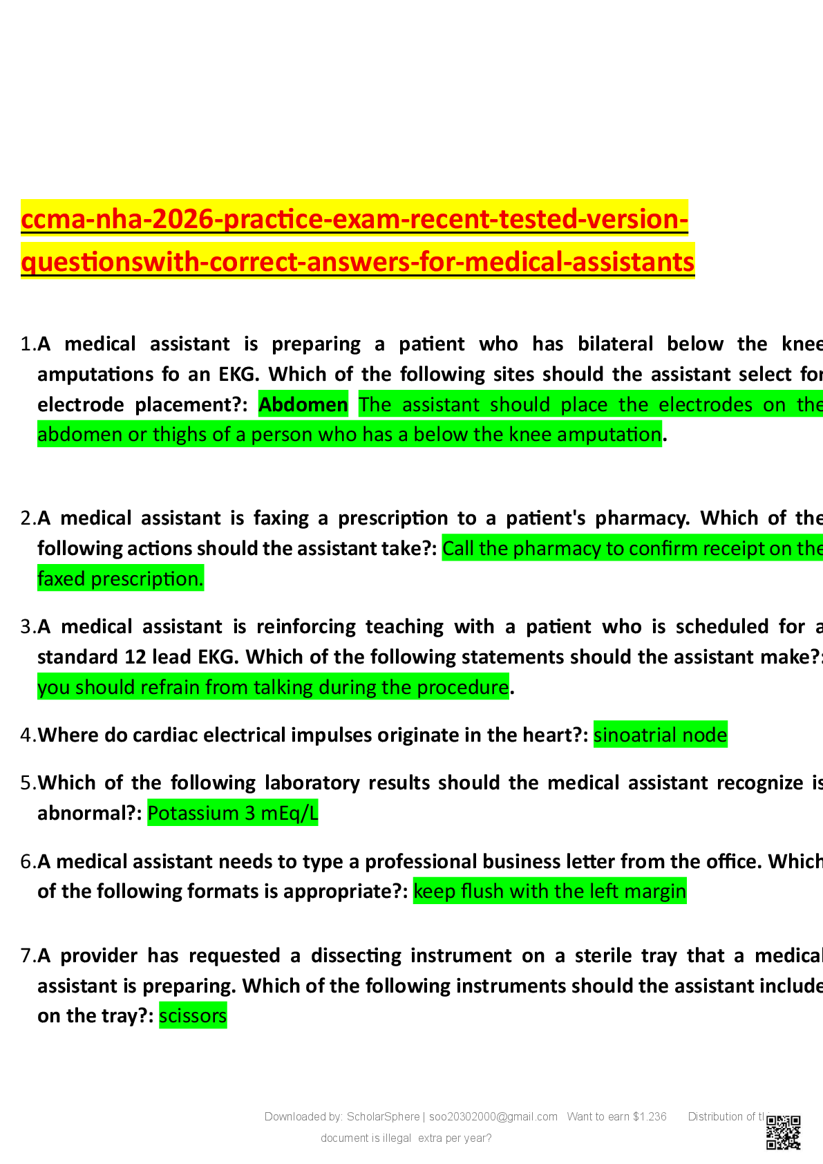 NHA CCMA > EXAM > CCMA NHA 2026 Practice Exam – Recent Tested Version 1 (180 Questions with Correct Answers) for Medical Assistants