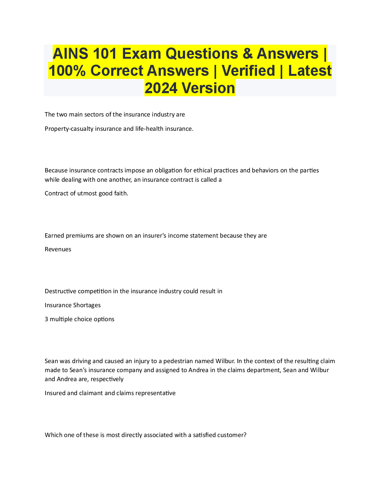 *NURSING > EXAM > AINS 101 Exam Questions & Answers | 100% Correct Answers | Verified | Latest 2024 Version