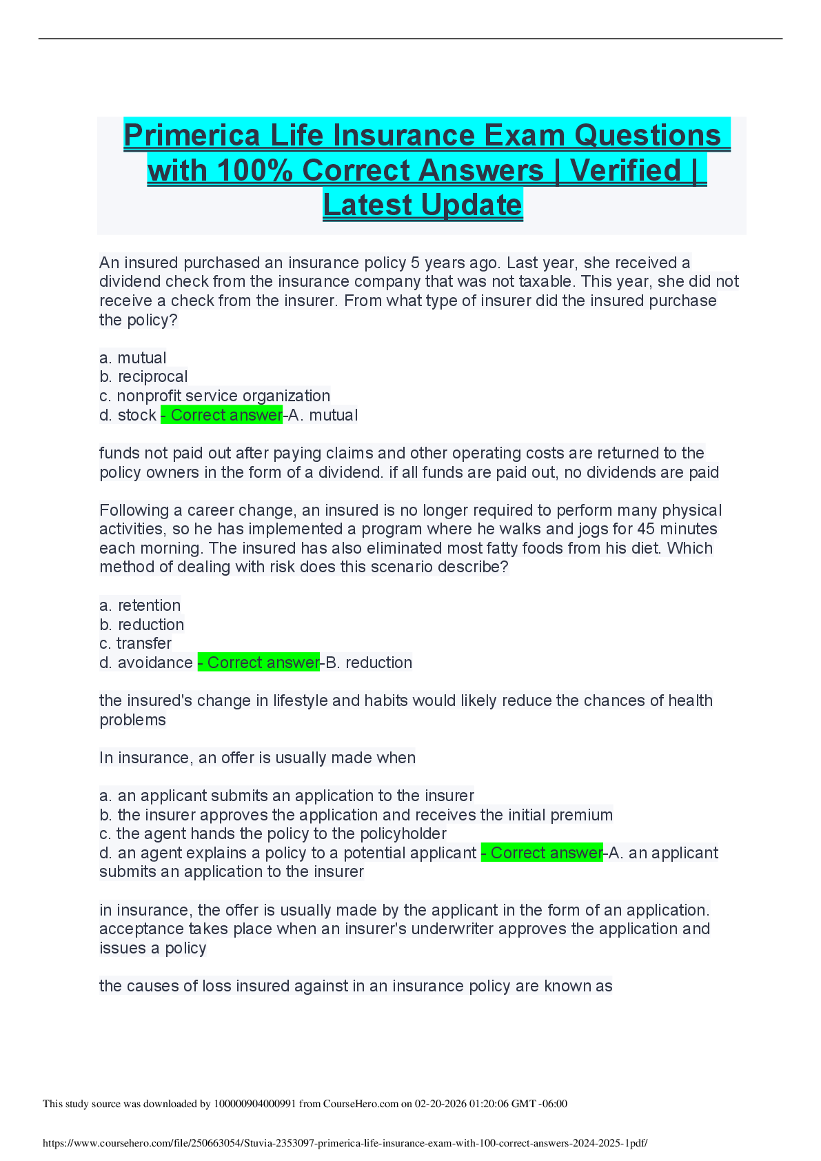 *NURSING > EXAM > Primerica Life Insurance Exam Questions with 100% Correct Answers | Verified | Latest Update