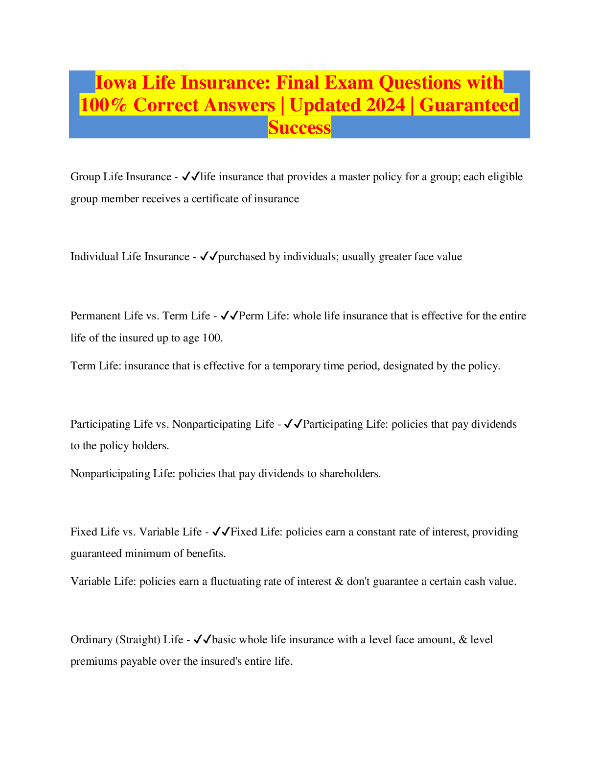 *NURSING > EXAM > Iowa Life Insurance: Final Exam Questions with 100% Correct Answers | Updated 2024 | Guaranteed Success