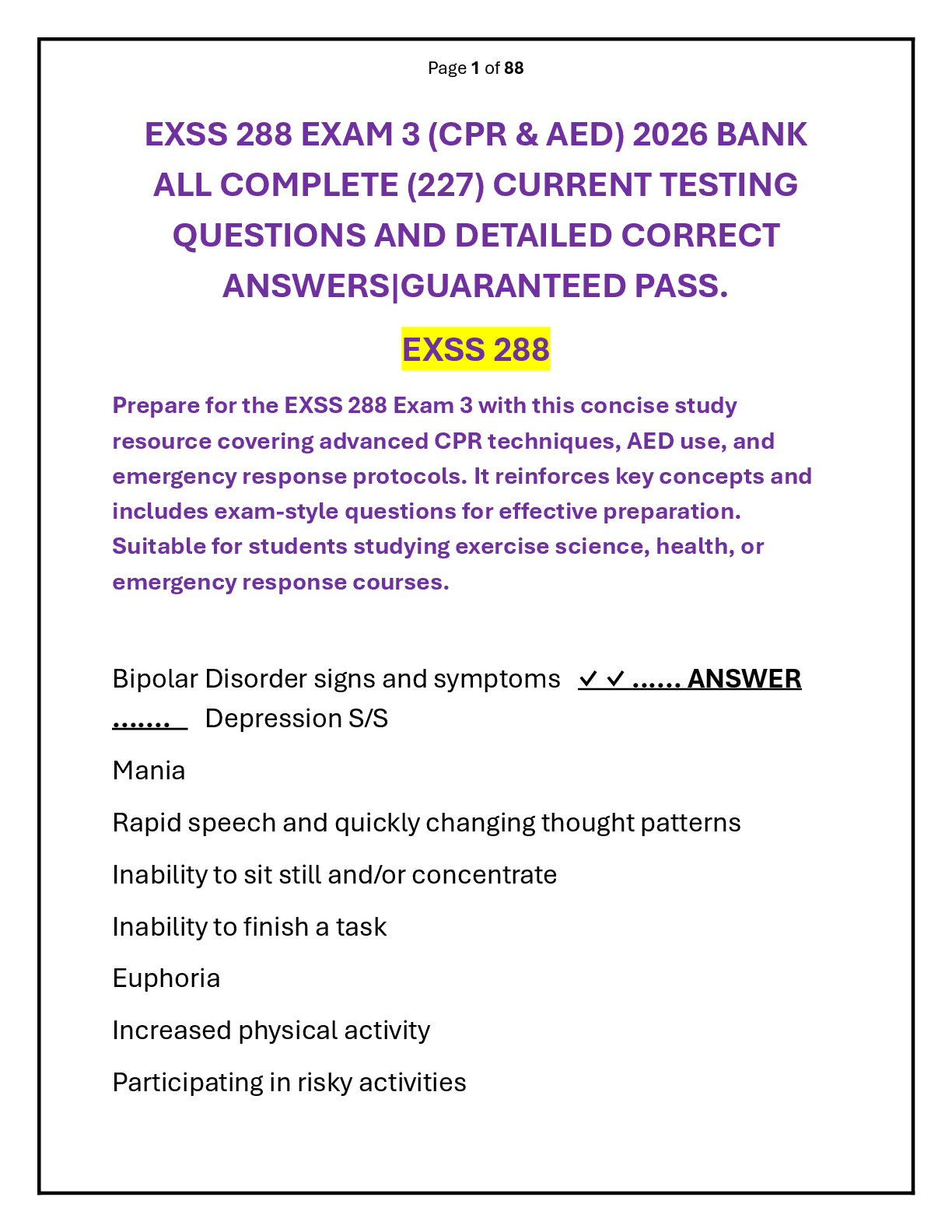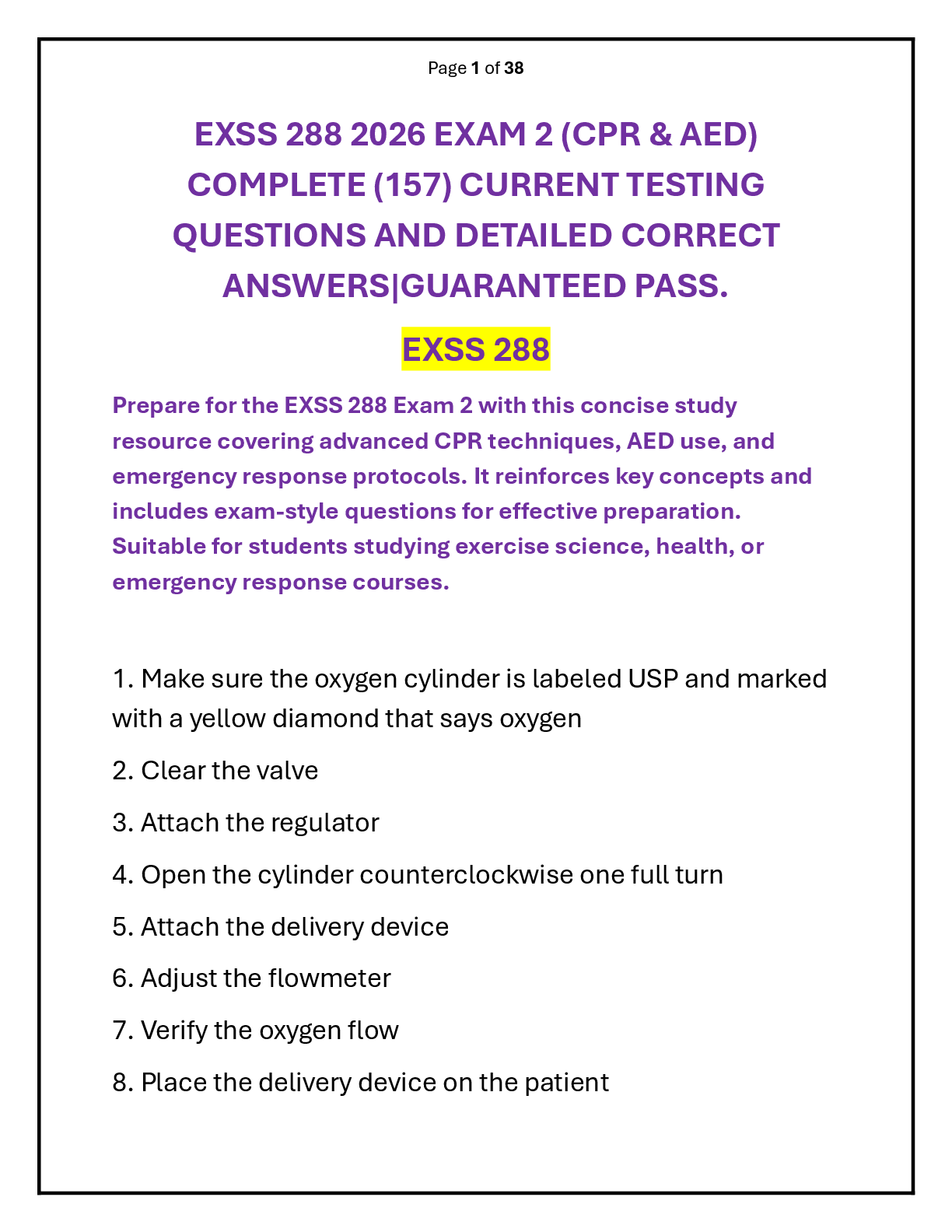Medical Studies > QUESTIONS & ANSWERS > EXSS 288 2026 EXAM 1 (CPR & AED) QUESTION AND ANSWER