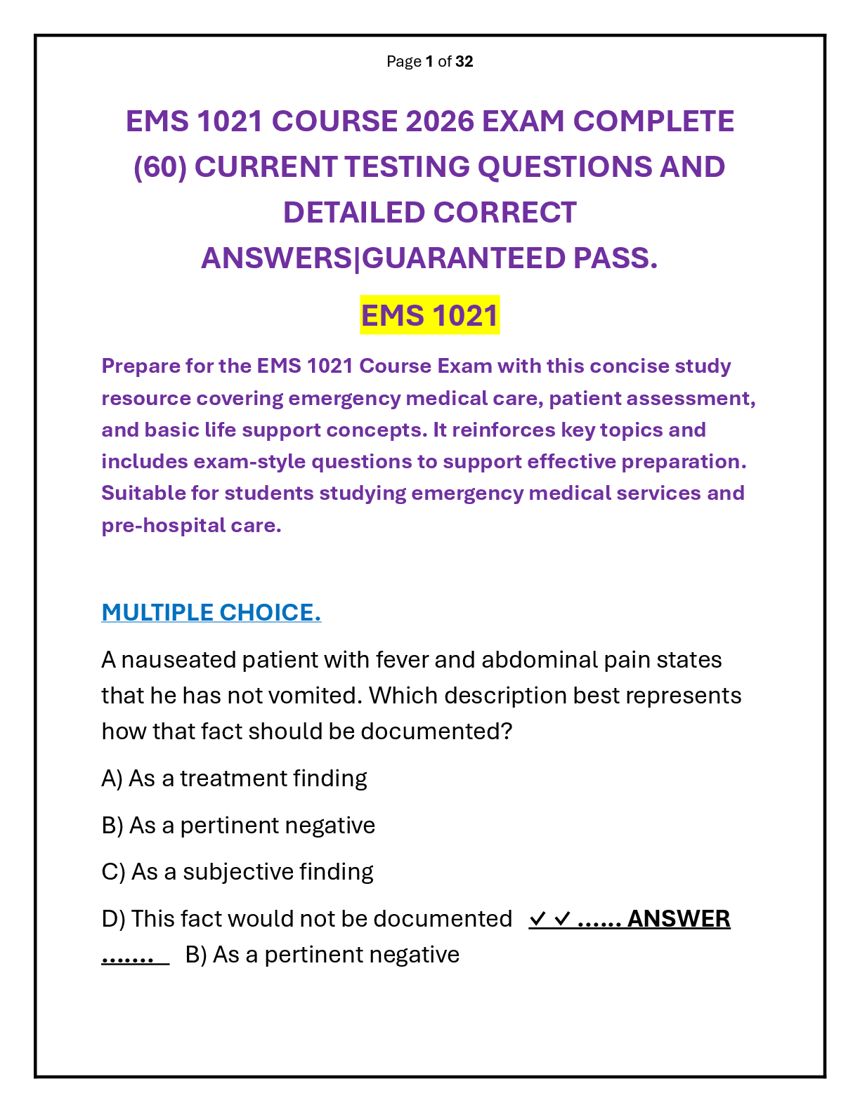 Medicine > QUESTIONS & ANSWERS > EMS 1021 COURSE 2026 EXAM QUESTION AND ANSWER