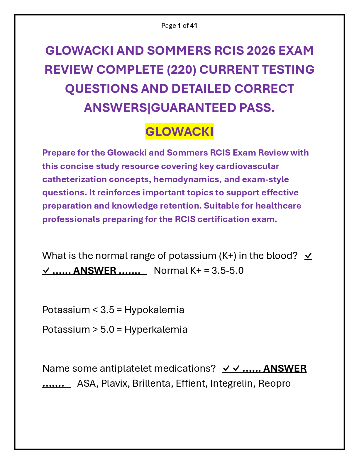 Medicine > QUESTIONS & ANSWERS > GLOWACKI AND SOMMERS RCIS 2026 EXAM REVIEW QUESTION AND ANSWER