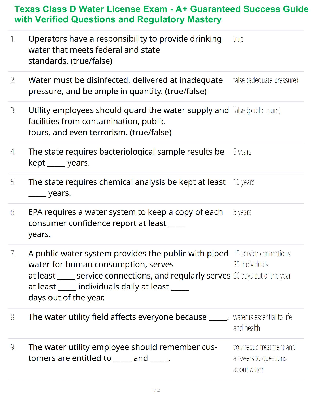 Health Care > STUDY GUIDE > Texas Class D Water License Exam - A+ Guaranteed Success Guide with Verified Questions and Regulatory Mastery