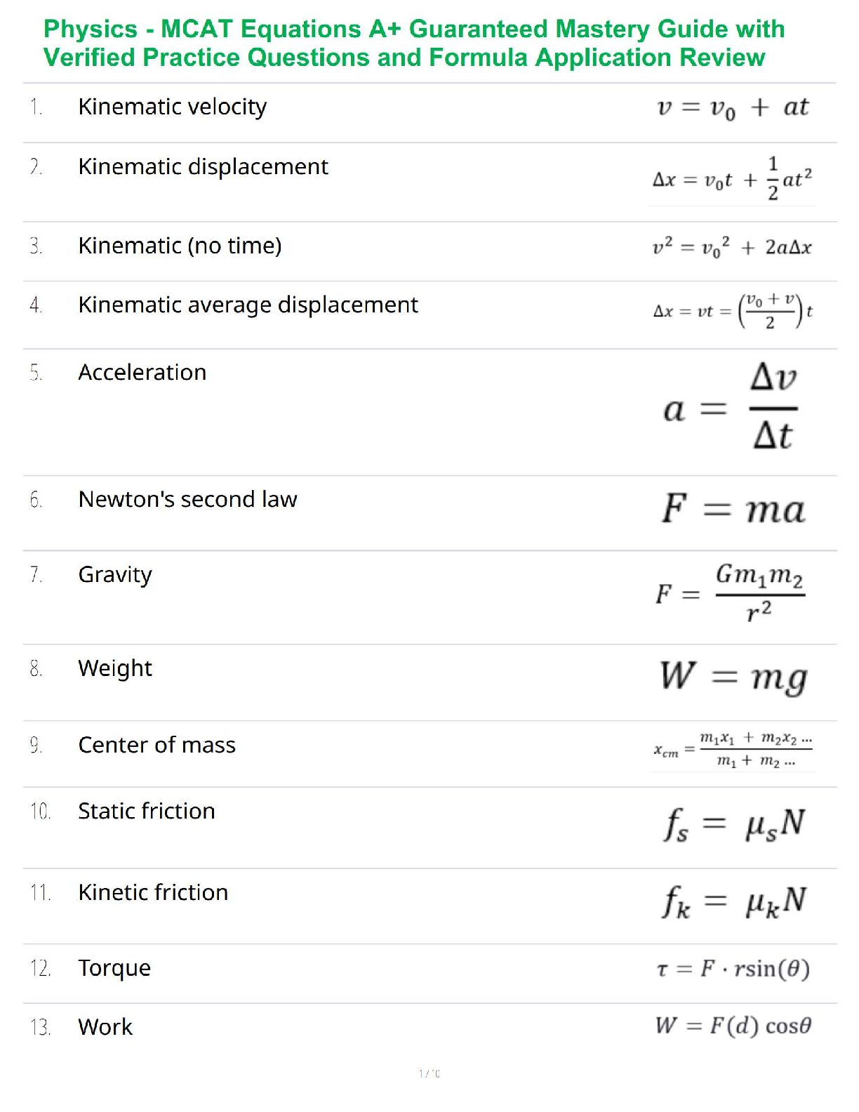 Physics > QUESTIONS & ANSWERS > Physics - MCAT Equations A+ Guaranteed Mastery Guide with Verified Practice Questions and Formula Application Review