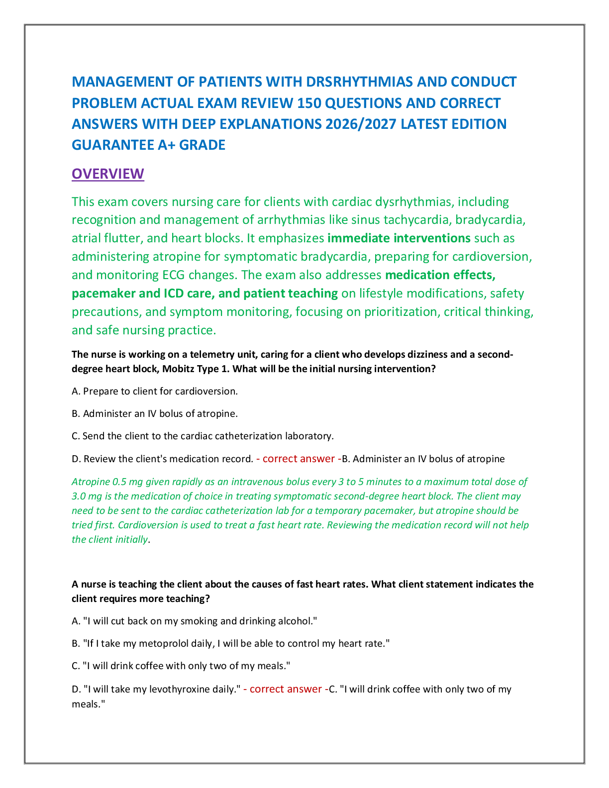 *NURSINGEXAM REVIEW  > MANAGEMENT OF PATIENTS WITH DRSRHYTHMIAS AND CONDUCT PROBLEM ACTUAL EXAM REVIEW 150 QUESTIONS AND CORRECT ANSWERS WITH DEEP EXPLANATIONS 2026/2027 LATEST EDITION GUARANTEE A+ GRADE