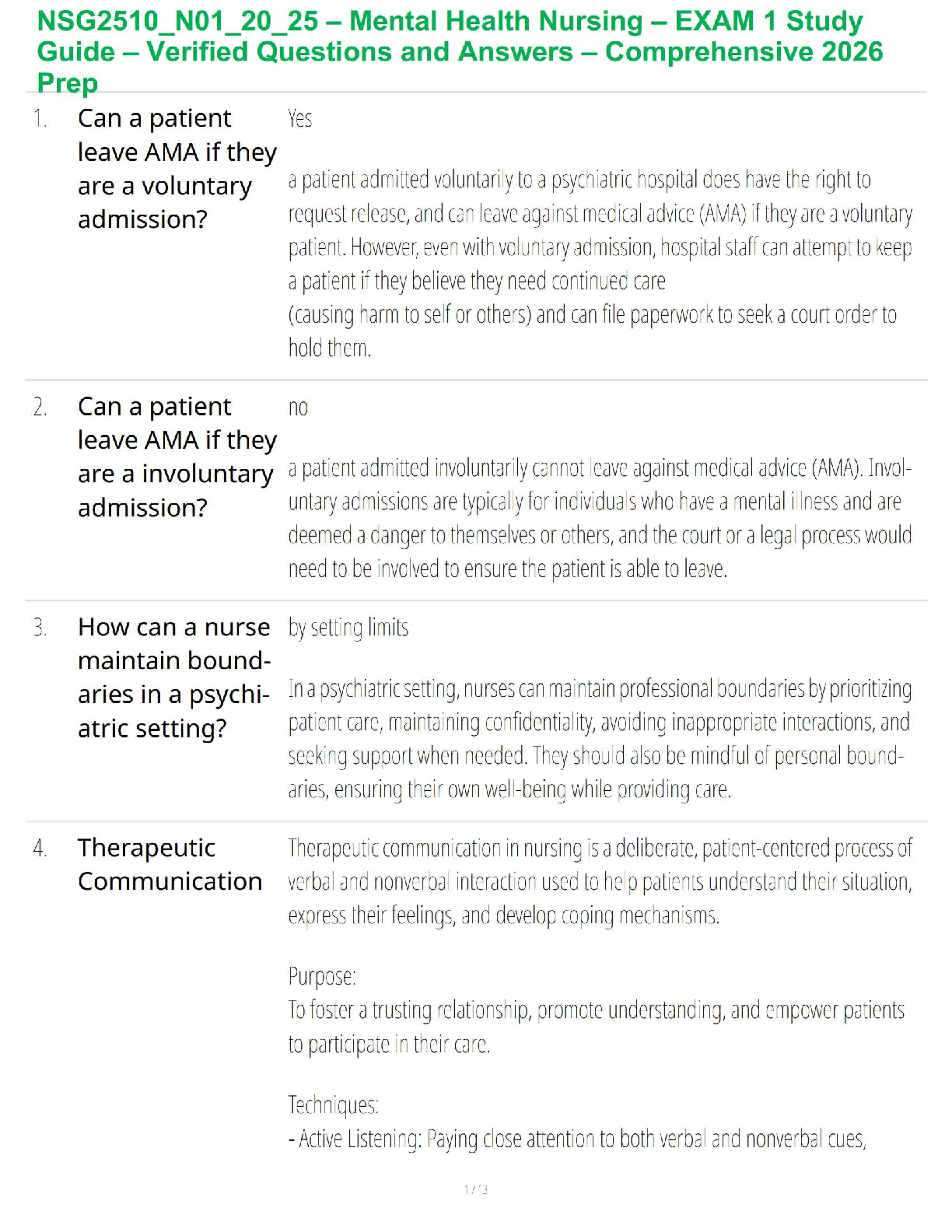 *NURSING > STUDY GUIDE > NSG2510_N01_20_25 – Mental Health Nursing – EXAM 1 Study Guide – Verified Questions and Answers – Comprehensive 2026 Prep