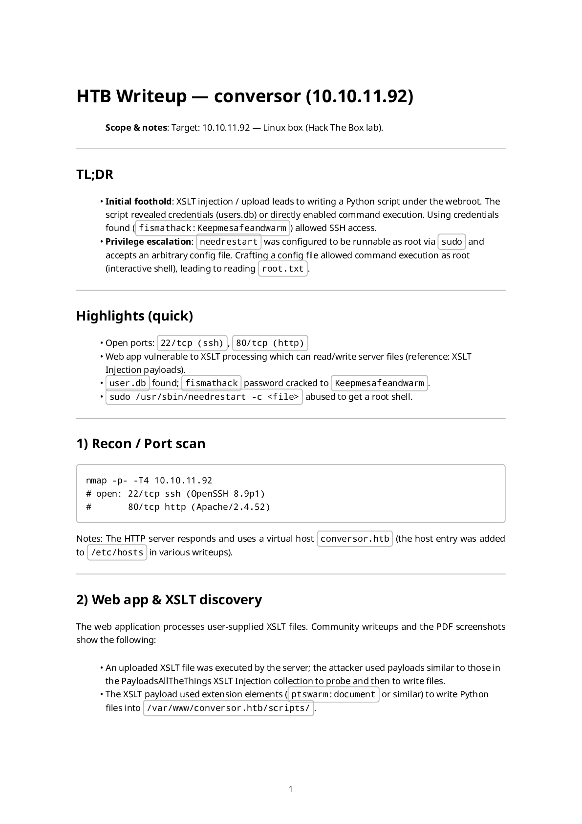 Programming > GUIDELINES > HTB Writeup — conversor (10.10.11.92) Scope & notes: Target: 10.10.11.92 — Linux box (Hack The Box lab).