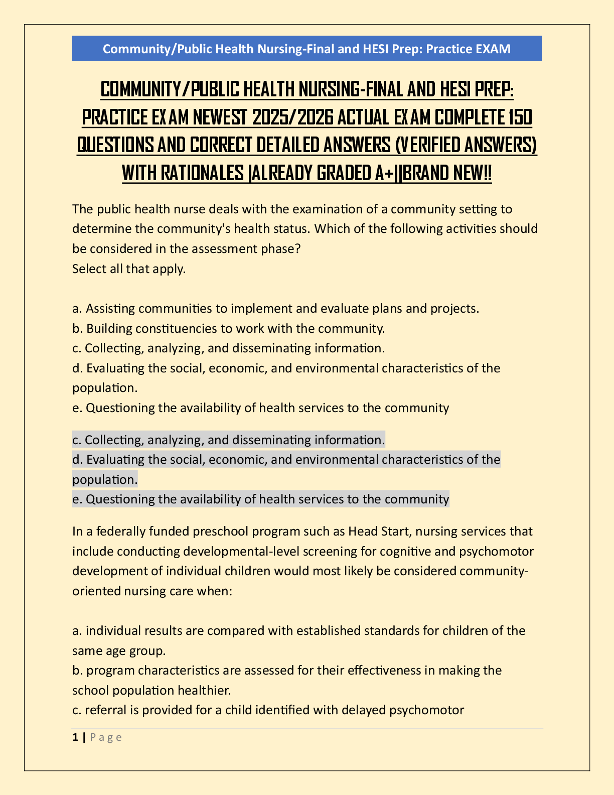*NURSING > HESI > COMMUNITY/PUBLIC HEALTH NURSING-FINAL AND HESI PREP: PRACTICE EXAM NEWEST 2025/2026 ACTUAL EXAM COMPLETE 150 QUESTIONS AND CORRECT DETAILED ANSWERS (VERIFIED ANSWERS) WITH RATIONALES |ALREADY GRADED A+||BRAND NEW!!
