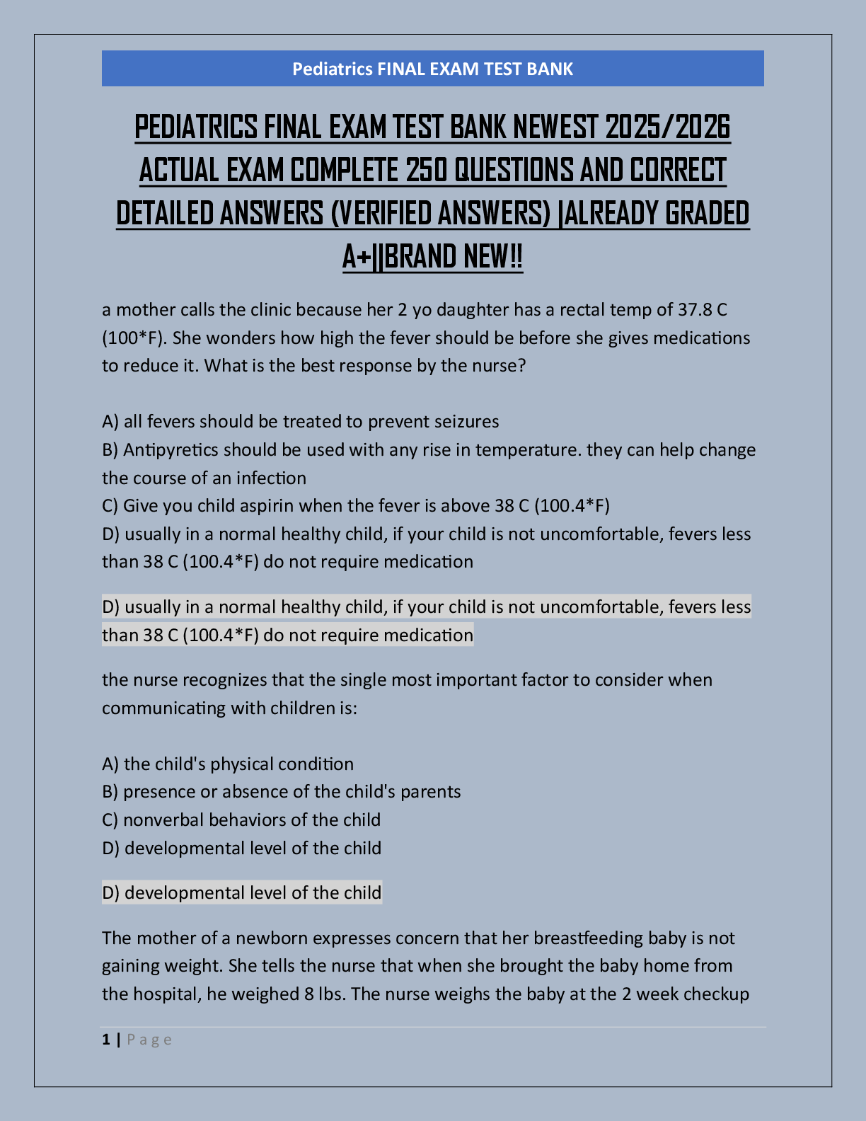 *NURSING > FINAL EXAM > PEDIATRICS FINAL EXAM TEST BANK NEWEST 2025/2026 ACTUAL EXAM COMPLETE 250 QUESTIONS AND CORRECT DETAILED ANSWERS (VERIFIED ANSWERS) |ALREADY GRADED A+||BRAND NEW!!
