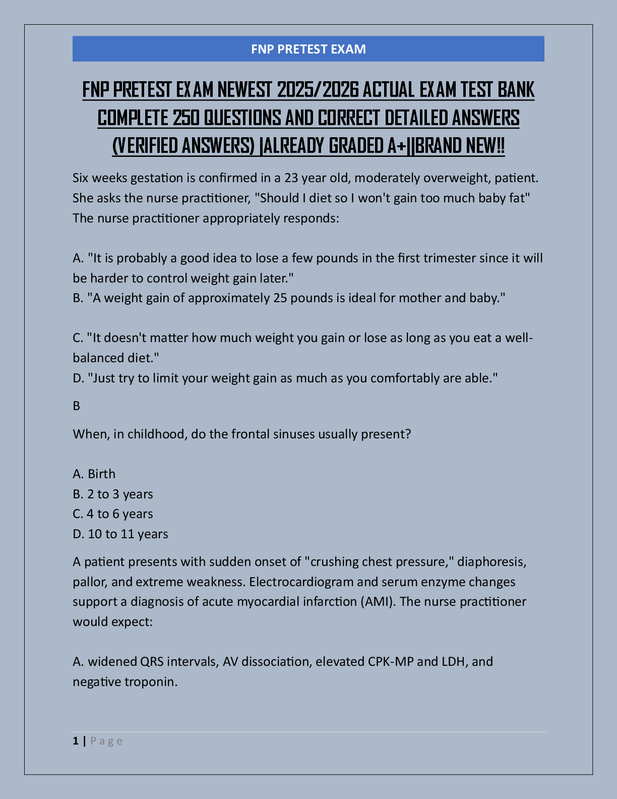 Medicine > EXAM > FNP PRETEST EXAM NEWEST 2025/2026 ACTUAL EXAM TEST BANK COMPLETE 250 QUESTIONS AND CORRECT DETAILED ANSWERS (VERIFIED ANSWERS) |ALREADY GRADED A+||BRAND NEW!!