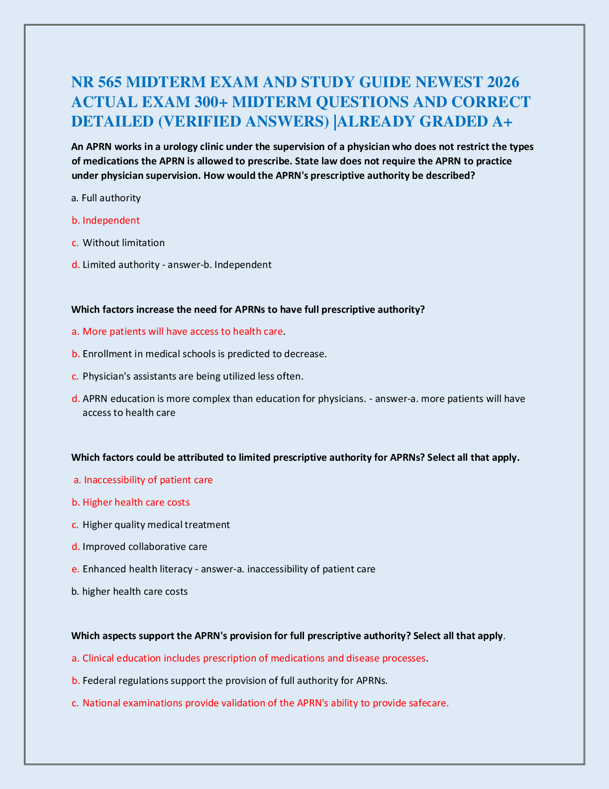 *NURSING > EXAM > NR 565 MIDTERM EXAM AND STUDY GUIDE NEWEST 2026 ACTUAL EXAM 300+ MIDTERM QUESTIONS AND CORRECT DETAILED (VERIFIED ANSWERS) |ALREADY GRADED A+