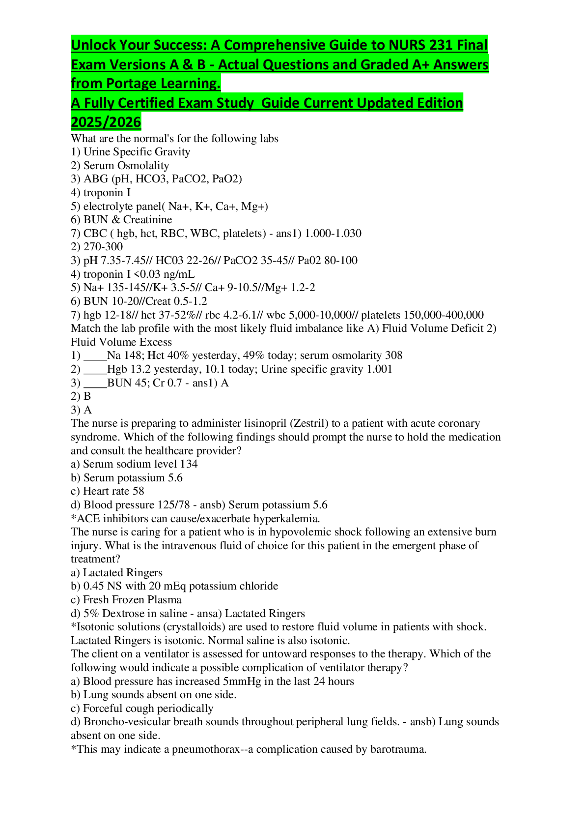 *NURSING > EXAM > A Comprehensive Guide to NURS 231 Final Exam Versions A & B - Actual Questions and Graded A+ Answers from Portage Learning. A Fully Certified Exam Study Guide Current Updated Edition 2025/2026