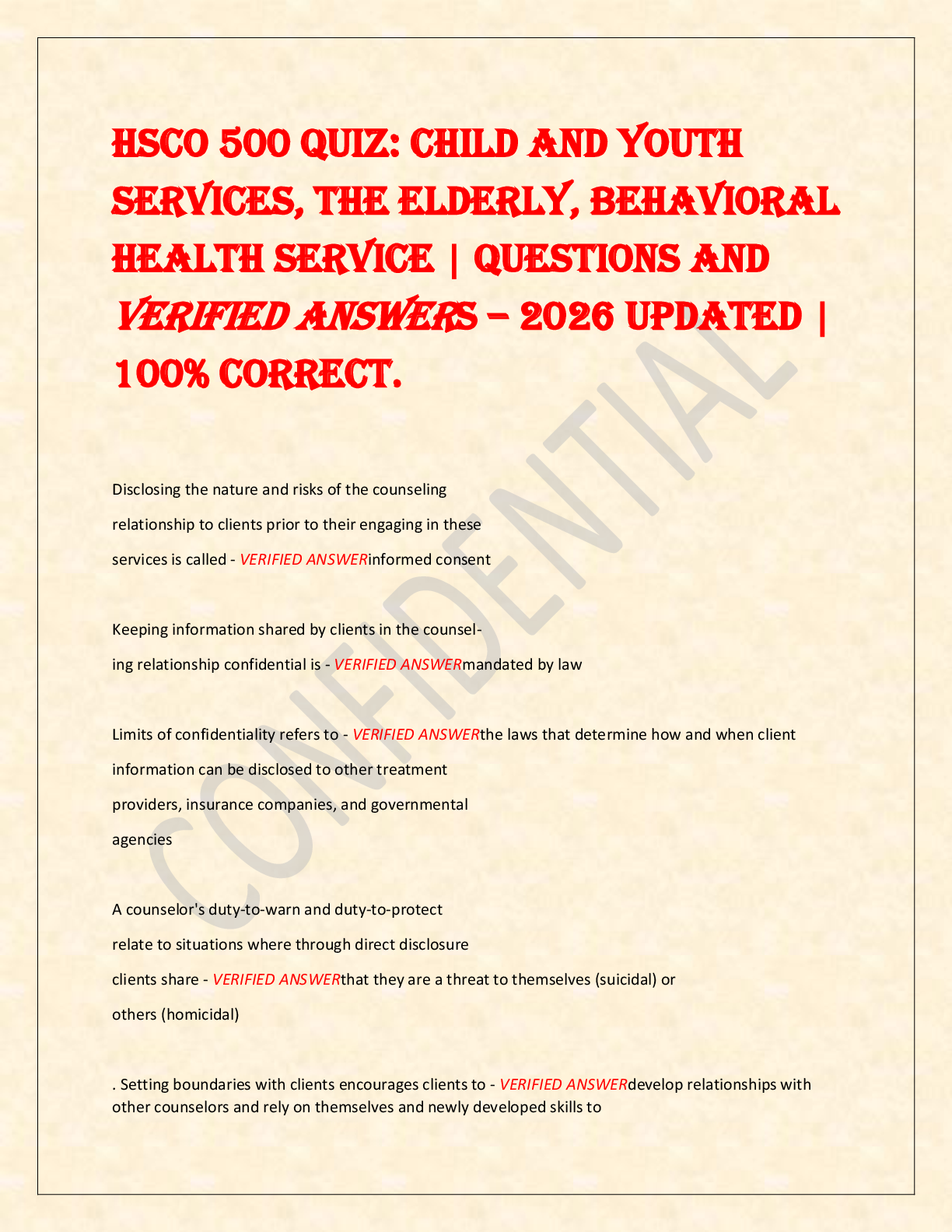 *NURSING > EXAM > HSCO 500 Quiz: Child and Youth Services, the Elderly, Behavioral Health Service | Questions and VERIFIED ANSWERs – 2026 Updated | 100% Correct.