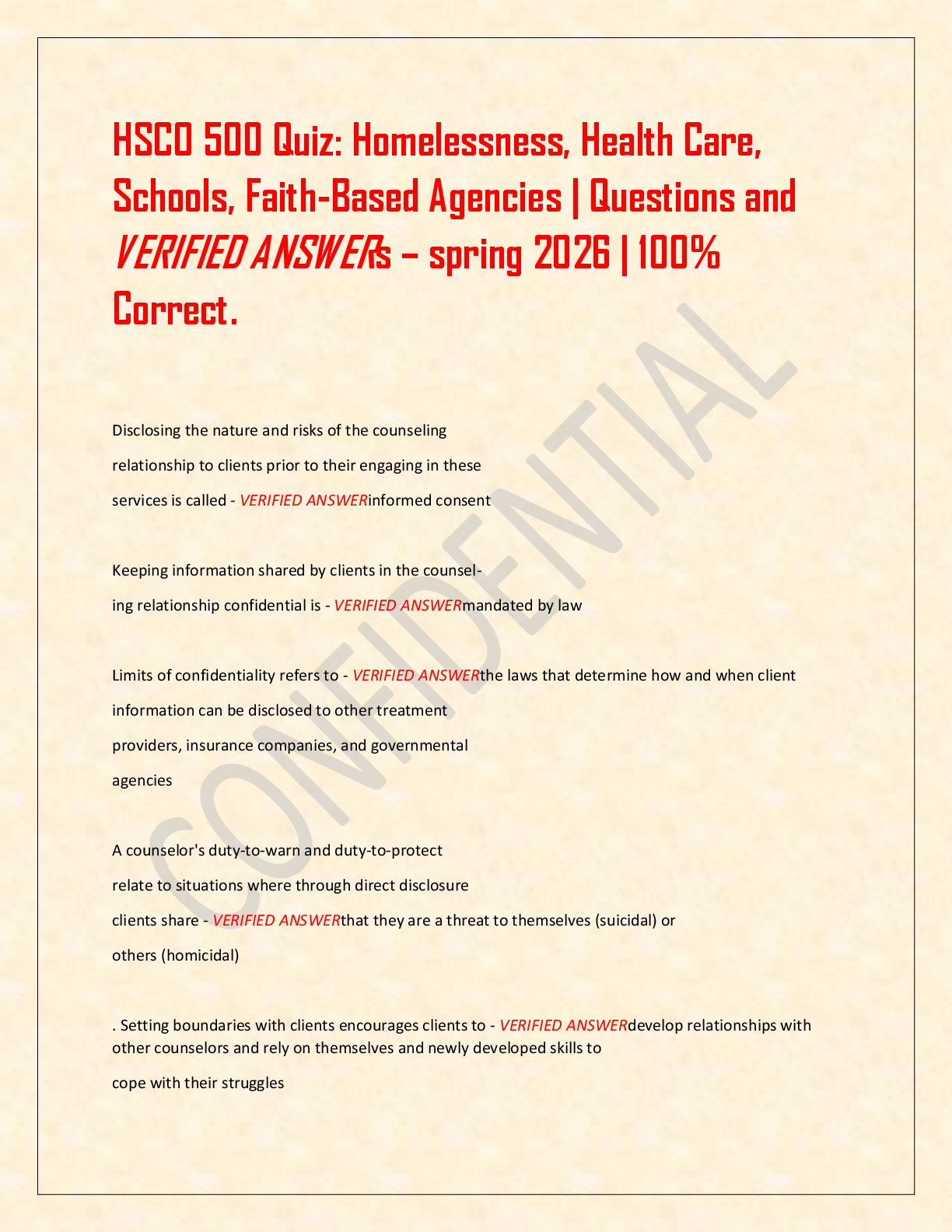 *NURSING > EXAM > HSCO 500 Quiz: Homelessness, Health Care, Schools, Faith-Based Agencies | Questions and VERIFIED ANSWERs – spring 2026 | 100% Correct.