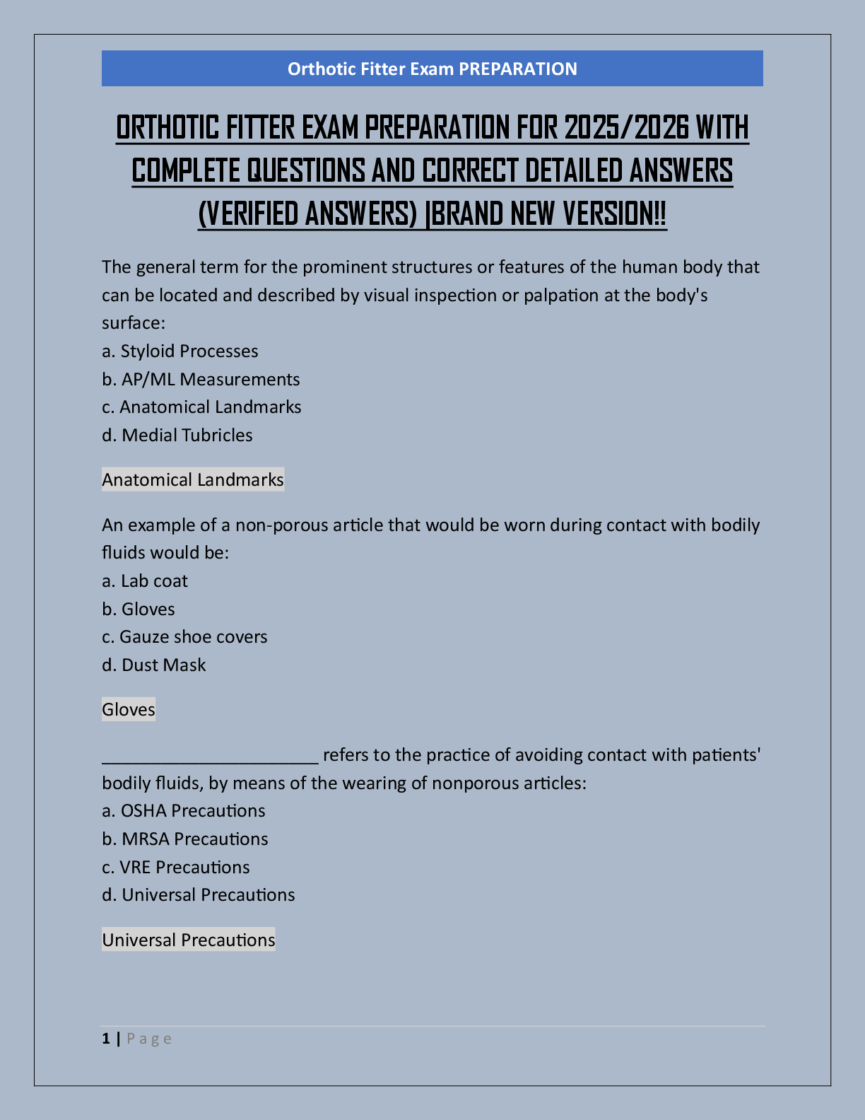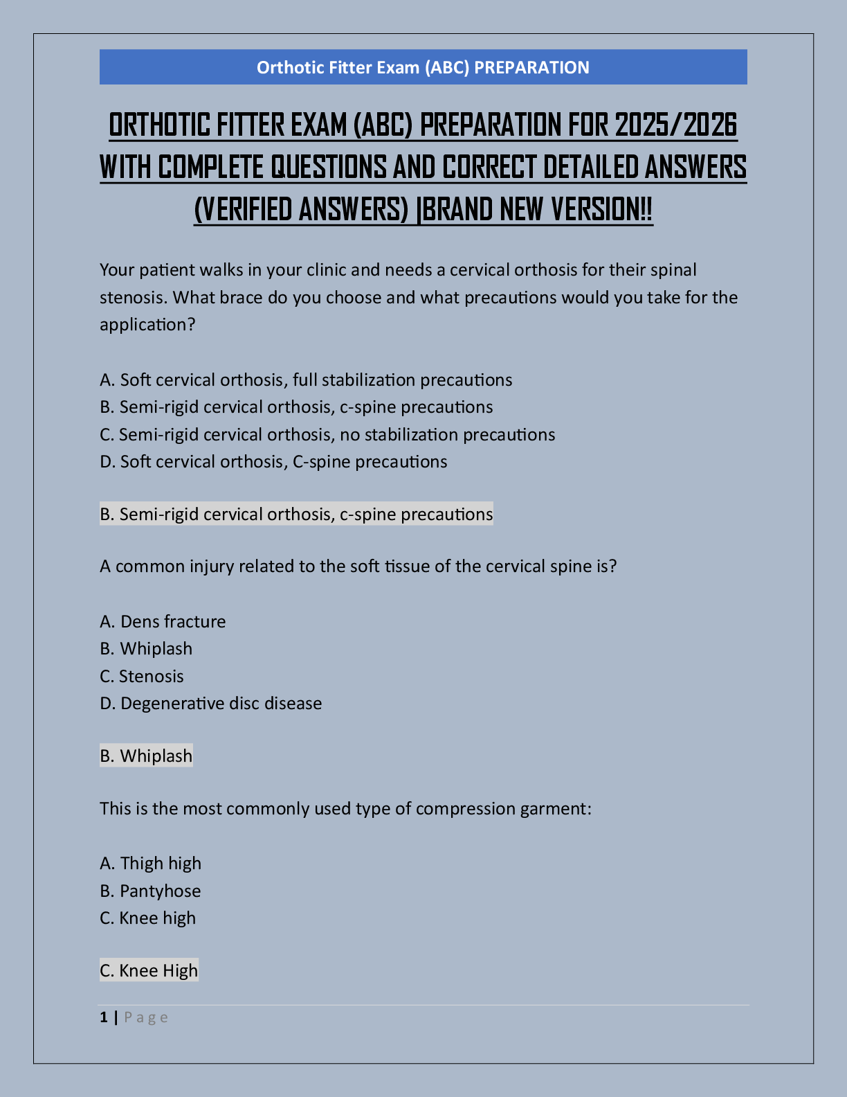 Physiotherapy > EXAM > ORTHOTIC FITTER EXAM (ABC) PREPARATION FOR 2025/2026 WITH COMPLETE QUESTIONS AND CORRECT DETAILED ANSWERS (VERIFIED ANSWERS) |BRAND NEW VERSION!!