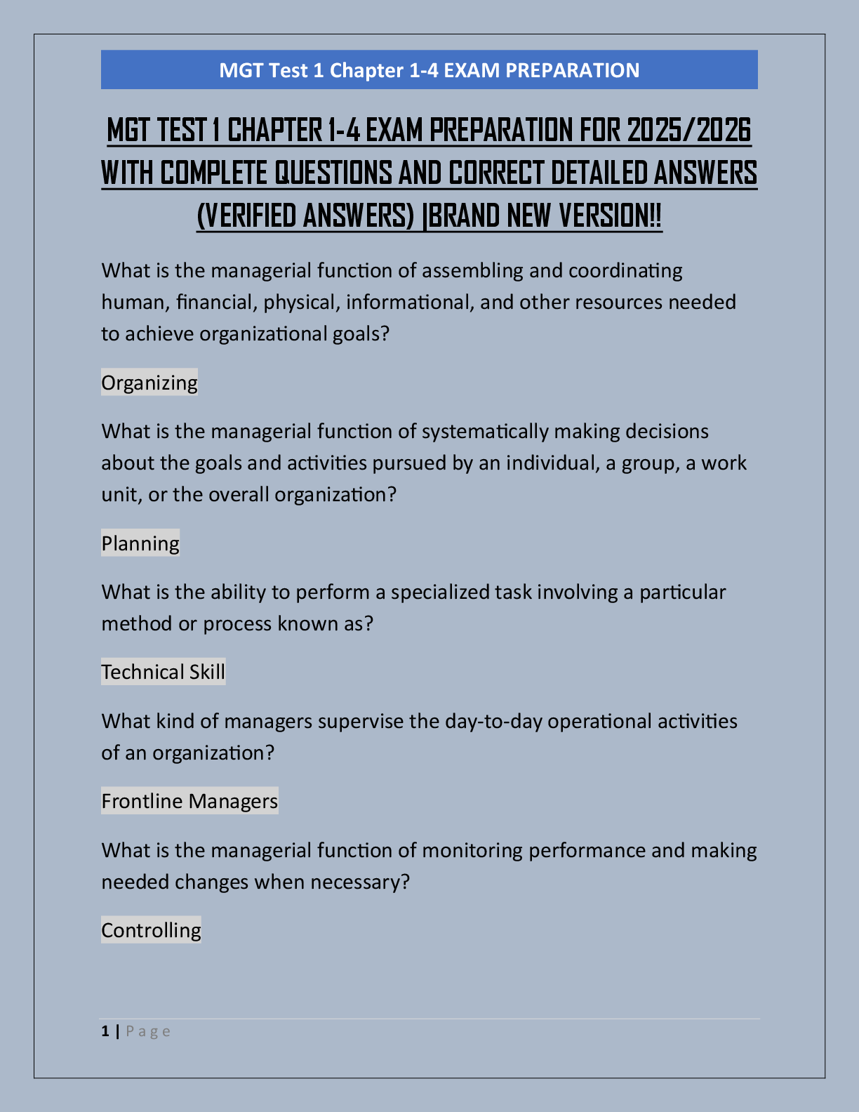 Business Management > EXAM > MGT TEST 1 CHAPTER 1-4 EXAM PREPARATION FOR 2025/2026 WITH COMPLETE QUESTIONS AND CORRECT DETAILED ANSWERS (VERIFIED ANSWERS) |BRAND NEW VERSION!!