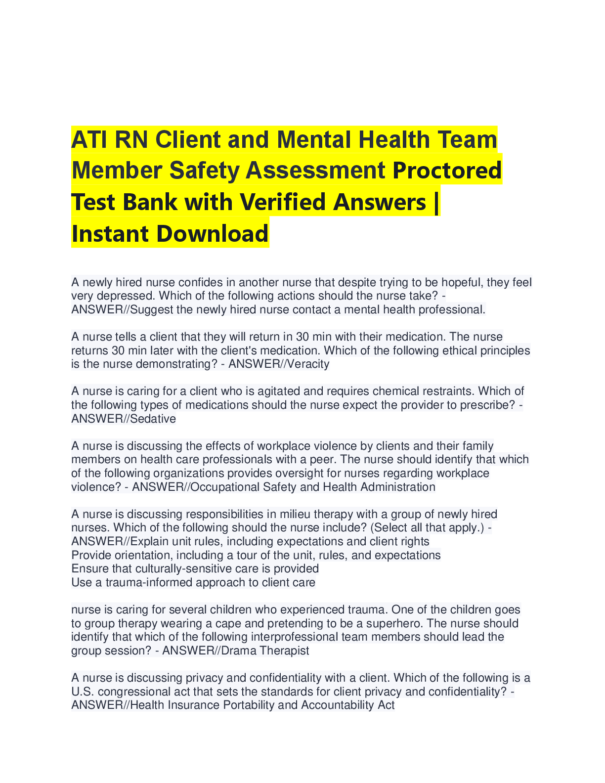 Safety Management > A-Level Question Paper > ATI RN Client and Mental Health Team Member Safety Assessment: Test Bank with Verified Answers | Proctored Exam Prep