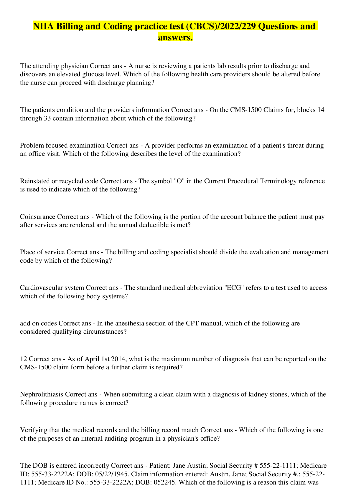 The symbol "O" in the Current Procedural Terminology reference is used to indicate what? - Ans-Reinstated or recycled code In the anesthesia section of the CPT manual, what are considered qualifyin ... g circumstances? - Ans-Add-on codes As of April 1, 2014 what is the maximum number of diagnoses that can be reported on the CMS-1500 claim form before a further claim is required? - Ans-12 What is considered proper supportive documentation for reporting CPT and ICD codes for surgical procedures? - Ans-Operative report What action should be taken first when reviewing a delinquent claim? - Ans-Verify the age of the account A claim can be denied or rejected for which of the following reasons? - Ans-Block 24D contains the diagnosis code A coroner's autopsy is comprised of what examinations? - Ans-Gross Examination Medigap coverage is offered to Medicare beneficiaries by whom? - Ans-Private third-party payers What part of Medicare covers prescriptions? - Ans-Part C What plane divides the body into left and right? - Ans-Sagittal Where can unlisted codes be found in the CPT manual? - Ans-Guidelines prior to each section Ambulatory surgery centers, home health care, and hospice organizations use which form to submit claims? - Ans-UB-04 Claim Form What color format is acceptable on the CMS-1500 claim form? - Ans-Red Who is responsible to pay the deductible? - Ans-Patient A patient's health plan is referred to as the "payer of last resort." What is the name of that health plan? - Ans-Medicaid Informed Consent - Ans-Providers explain medical or diagnostic procedures, surgical interventions, and the benefits and risks involved, giving patients an opportunity to ask questions before medical intervention is provided. Implied Consent - Ans-A patient presents for treatment, such as extending an arm to allow a venipuncture to be performed. Clearinghouse - Ans-Agency that converts claims into standardized electronic format, looks for errors, and formats them according to HIPAA and insurance standards. Individually Identifiable - Ans-Documents that identify the person or provide enough information so that the person can be identified. De-identified Information - Ans-Information that does not identify an individual because unique and personal characteristics have been removed. Consent - Ans-A patient's permission evidenced by signature. Authorizations - Ans-Permission granted by the patient or the patient's representative to release information for reasons other than treatment, payment, or health care operations. Reimbursement - Ans-Payment for services rendered from a third-party payer. Auditing - Ans-Review of claims for accuracy and completeness. Fraud - Ans-Making false statements of representations of material facts to obtain some benefit or payment for which no entitlement would otherwise exist. Upcoding - Ans-Assigning a diagnosis or procedure code at a higher level than the documentation supports, such as coding bronchitis as pneumonia. Unbundling - Ans-Using multiple codes that describe different components of a treatment instead of using a single code that describes all steps of the procedure. Abuse - Ans-Practices that directly or indirectly result in unnecessary costs to the Medicare program. Business Associate (BA) - Ans-Individuals, groups, or organizations who are not members of a covered entity's workforce that perform functions or activities on behalf of or for a covered entity. What is the main job of the Office of the Inspector General (OIG)? - Ans-The OIG protects Medicare and other HHS programs from fraud and abuse by conducting audits, investigations , and inspections. Medicare - Ans-Federally funded health insurance provided to people age 65 or older, and people 65 and younger with certain disabilities. Medicaid - Ans-A government-based health insurance option that pays for medical assistance for individuals who have low incomes and limited financial resources. Timely Filing Requirements - Ans-Within 1 calendar year of a claim's date of service. Electronic Data Interchange (EDI) - Ans-The transfer of electronic information in a standard form. Coordination of Benefits Rules - Ans-Determines which insurance plan is primary and which is secondary. Conditional Payment - Ans-Medicare payment that is recovered after primary insurance pays. Crossover Claim - Ans-Claim submitted by people covered by a primary and secondary insurance plan. Assignment of Benefits - Ans-Contract in which the provider directly bills the payer and accepts the allowable charge. Allowable Charge - Ans-The amount an insurer will accept as full payment, minus applicable cost sharing. Clean Claim - Ans-Claim that is accurate and complete. They have all the information needed for processing, which is done in a timely fashion. Dirty Claim - Ans-Claim that is inaccurate, incomplete, or contains other errors. Medicare Administrative Contractor (MAC) - Ans-Processes Medicare Parts A and B claims from hospitals, physicians, and other providers. Remittance Advice (RA) - Ans-The report sent from the third-party payer to the provider that reflects any changes made to the original billing. Explanation of Benefits (EOB) - Ans-Describes the services rendered, payment covered, and benefit limits and denials. National Provider Identifier (NPI) - Ans-Unique 10-digit code fro providers required by HIPAA. Heath Maintenance Organization (HMO) - Ans-Plan that allows patients to only go to physicians, other health care professionals, or hospitals on a list of approved providers, except in an emergency. Modifier - Ans-Additional information about types of services, and part of valid CPT or HCPCS codes. By signing block 12 of CMS-1500 form, a patient is doing what? - Ans-Authorizes the release of medical information. Claim - Ans-Complete record of the services provided by the health care professional, along with appropriate insurance information. Where does the NPI number go on the CMS-1500 form? - Ans-17b What are two pieces of information t