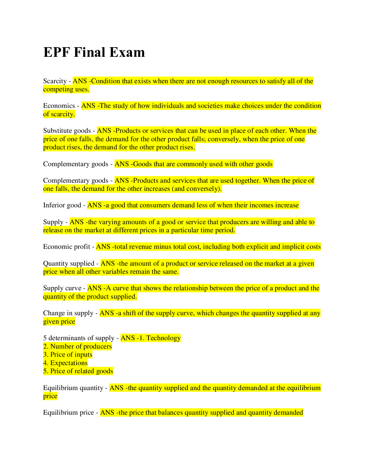 medium of exchange - ANS -This term means money will be accepted as a final payment for goods and services store of value - ANS -This term means money will be worth the same in the future as it is ... in the present measure of value - ANS -This term means money makes it easier to compare the values of goods and services barter - ANS -This term means trading goods and services with someone else to receive other goods and services double coincidence of wants - ANS -This is the main problem with barter - you must have what the other person wants and they must have what you want commodity money - ANS -This has value because it is naturally valuable (ex. gold coin) fiat money - ANS -This has value because the government has declared that it is legal tender and is acceptable for payment of debt US Mint - ANS -This US agency creates coins Department of the Treasury - ANS -This is the Department over the US Mint, Bureau of Engraving and Printing, and the Internal Revenue Service Bureau of Engraving and Printing - ANS -This US agency creates currency (paper money) Internal Revenue Service (IRS) - ANS -This US agency collects taxes income - ANS -This is how money enters our lives earned income - ANS -This is money we receive from work unearned income - ANS -This is money we receive from sources other than work windfall income - ANS -This is unexpected income, usually a large amount (ex. inheritance, gambling winnings) education - ANS -This is the most influential factor influencing a persons' income unskilled workers - ANS -These workers make less money because anyone could do the job skilled workers - ANS -These workers make more money because they have the skills or education to do the job that others may not have benefits - ANS -These are additional things given to employees besides their pay (ex. health insurance, vacation days) salary - ANS -This is a yearly amount of money that a person makes, regardless of hours worked wages - ANS -This is an hourly amount of money that a person makes paystub - ANS -This comes with your paycheck and tells you important information about the pay period the paycheck covers required deductions - ANS -These deductions are mandatory for all paychecks (local, state, & federal taxes, Medicare tax, Social Security tax) court mandated deductions - ANS -These deductions that are only required if the courts impose it (ex. child support, garnishments) optional deductions - ANS -These deductions that are chosen by the employee (ex. health insurance, life insurance) direct deposit - ANS -This means your paycheck is automatically deposited into your account (you do not receive a paper paycheck) gross pay - ANS -This is money made from wages or salary before taxes are taken out net pay - ANS -This is money made from wages or salary after taxes are taken out overtime pay - ANS -This is earned after you work 40 hours in one week (you earn 1.5 times more) take-home pay - ANS -This is another term for net pay [Show More]