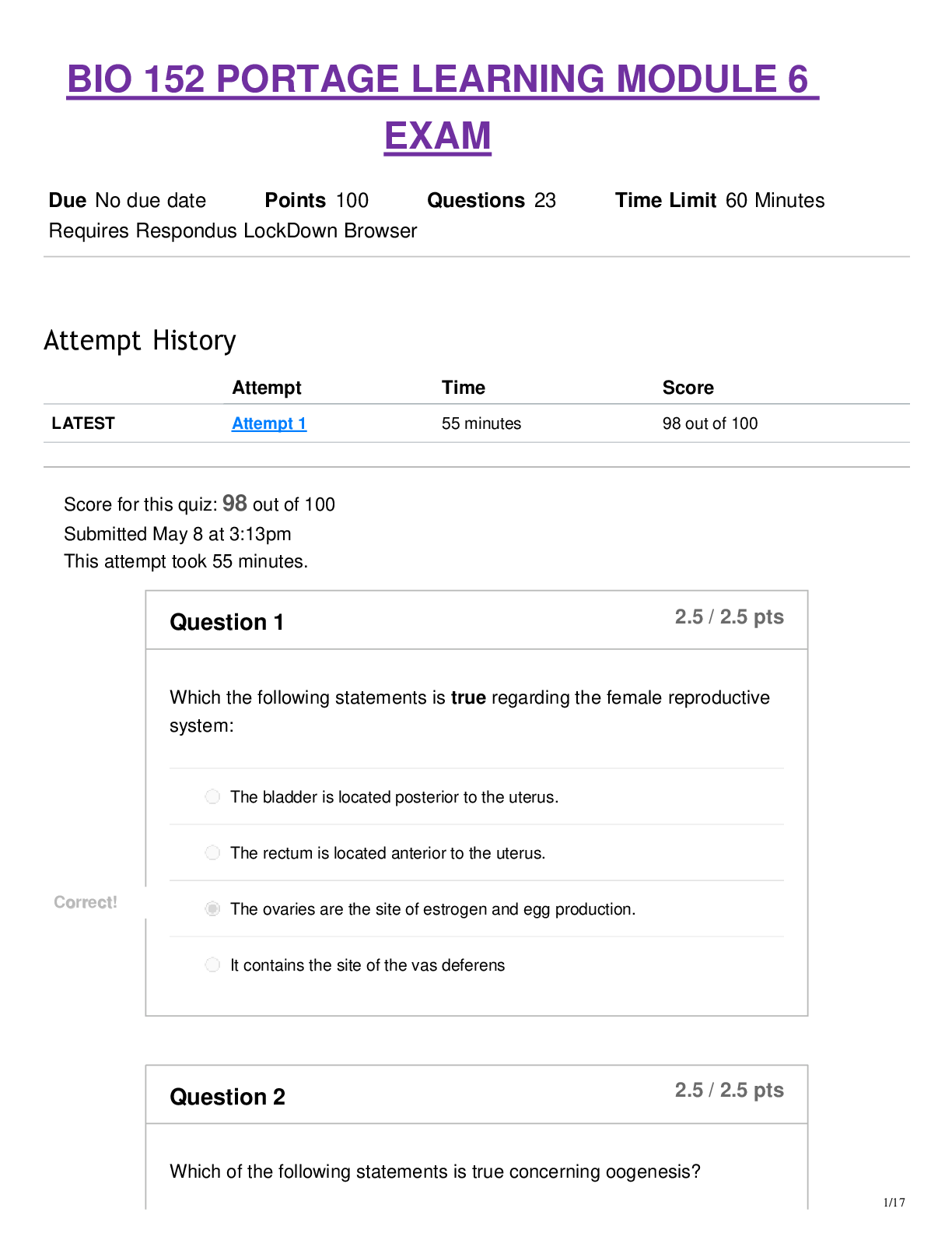 PORTAGE LEARNING BIO 152 MODULE 1-6 EXAM(2021 SERIES) ESSENTIAL HUMAN ANATOMY & PHYSIOLOGY II (REQUIRES RESPONDUS LOCK DOWN BROWSER + WEBCAM) ALL BUNDLED IN ONE PACKAGE.\VERIFIED AND RATED A