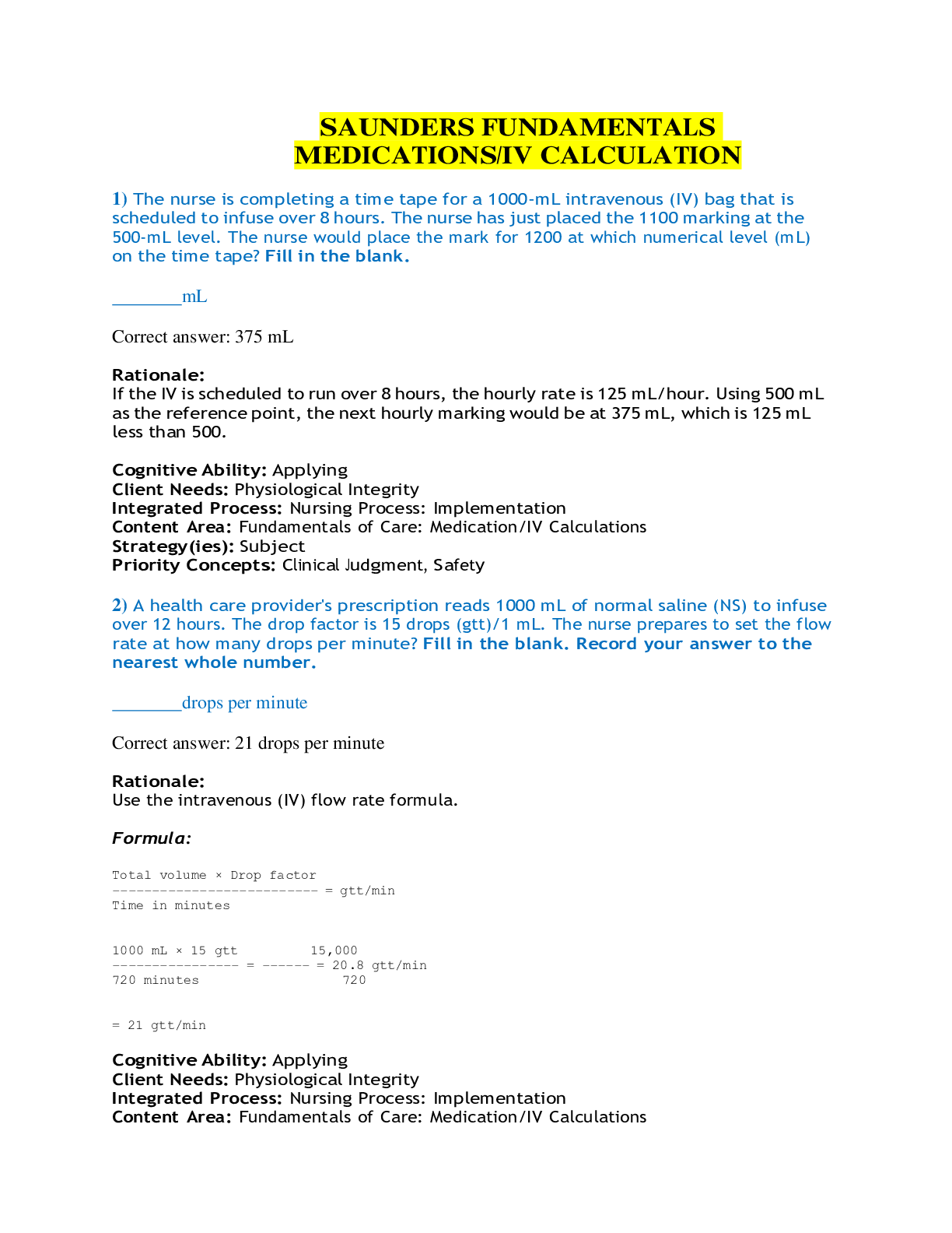 BUNDLE FOR SAUNDERS COMPREHENSIVE REVIEW FOR NCLEX (COMPLEX LATEST) 2020/2021 A | SAUNDERS COMPREHENSIVE REVIEW FOR NCLEX ONE & TWO | N601 Saunders Fundamentals Medications & IV Calculations Week 7, L...