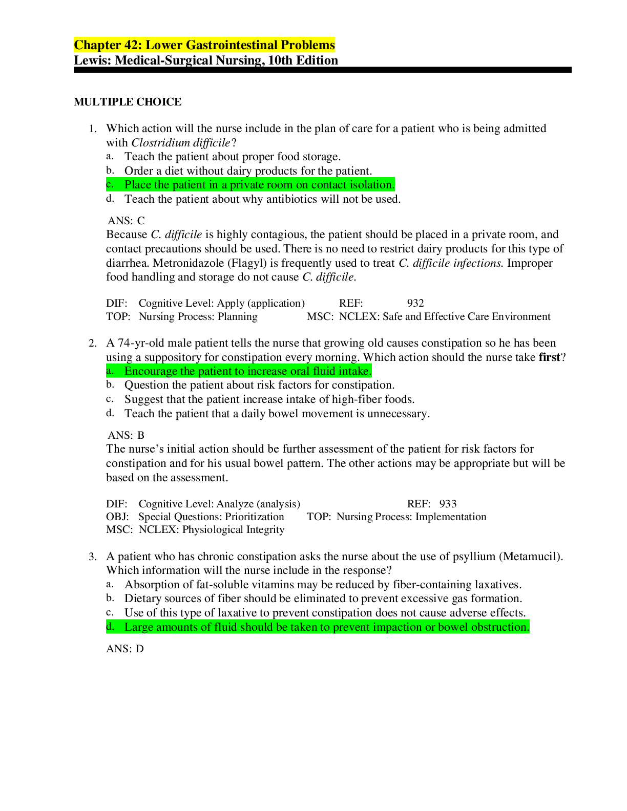 1. A patient who is hospitalized with watery, incontinent diarrhea is diagnosed with Clostridium